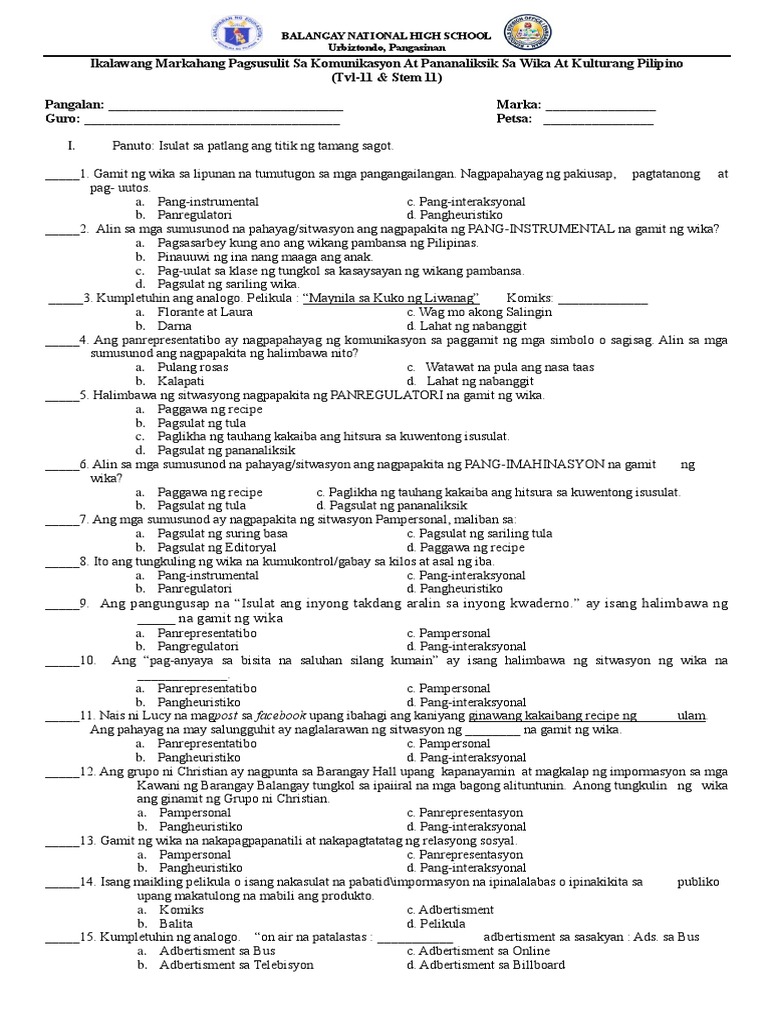 2nd Sem Exam Komunikasyon At Pananaliksik Sa Wika At Kulturang Filipino Pdf