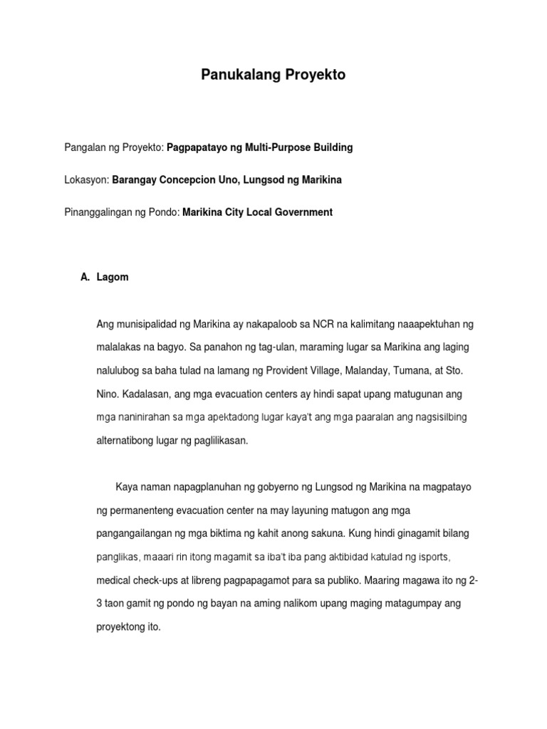Halimbawa Ng Panukalang Proyekto Sa Barangay Halimbawa