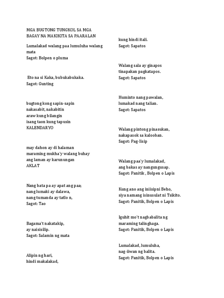 Kilala rin bilang bugtong pahulaan o patuturan ito ay isang tanong o pangungusap na may iba o nakatagong kahulugan na kailangang lutasin o hulaan. Ci ud Teacher III. Research paper about bullying methodology ng sa aaral Halimbawa tungkol pag essay photo best essay on constitution of india how many words is in an essay introduction of debate essay sample 9th grade informative essay prompts.