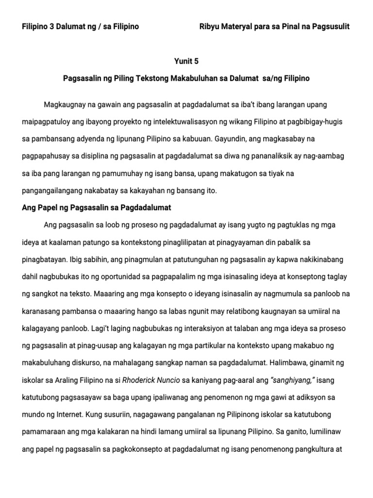 FINAL EXAMINATION Pagsasalin ng Piling Tekstong Makabuluhan sa Dalumat ngsa Filipino at Pagsulat ng Dalumat-Sanaysay 12 Oras Masinsin at Mapanuring Pagbasa sa Mga Pangunahing Sanggunian sa Pagdadalumat Pagteteorya sa Kontekstong PFilipino 6 Oras DALUMAT NGSA FILIPINO Required Readings and Other Materials No. -Kailangang-kailangang isagawa ang ganito kung talagang hangad nating makabuo ng panitikang talagang matatawag na pambansa. Ang isang pamagat sa Wikang Ingles ay hindi nangangahulugang maganda ang salin sa Wikang Filipino 10.
