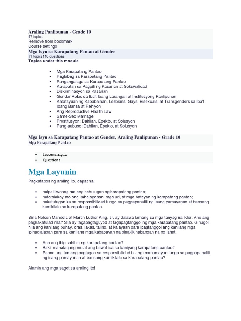 KARAPATANG PANTAO Ang lahat ng tao ay may karapatang mabuhay nang Malaya at may dignidad. PanutoSuriin kung ang mga paglabag sa karapatang pantao na umiiral ay sa pamilya barangaypamayanan o lipunanbansa. Sa mga kamakailang isyu na nakapalibot sa kontrobersyal na pagpatay sa 17-taong-gulang na si Kian Loyd Delos Santos ang kahalagahan ng mga karapatang pantao ng Pilipino ay binigyang diin.