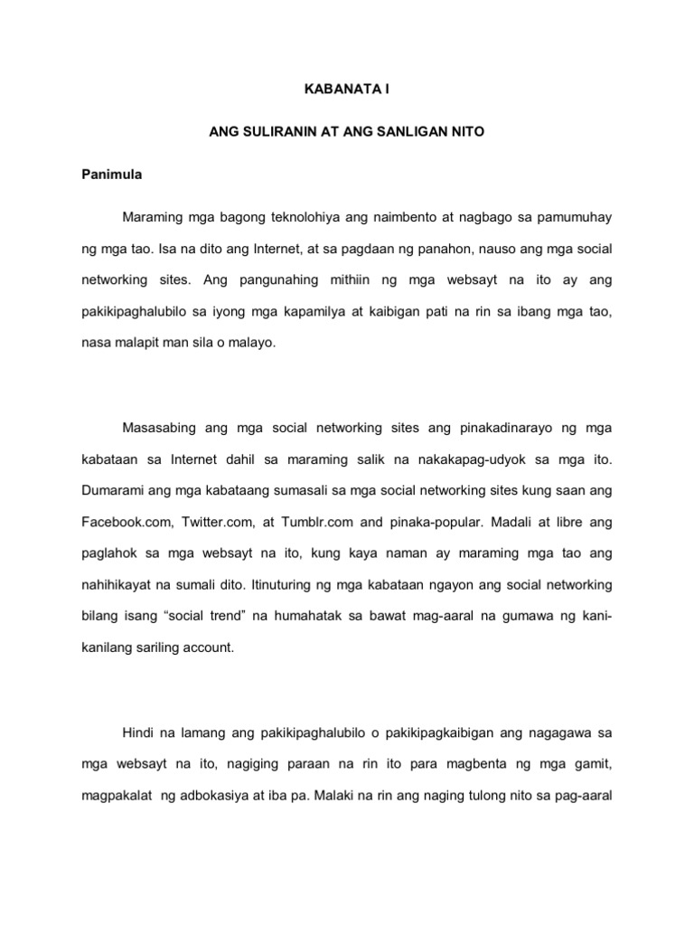 Pananaliksik tungkol sa social media. EPEKTO NG TEKNOLOHIYA SA MGA MAG-AARAL PARTIKULAR SA PAG GAMIT NG MGA SOCIAL MEDIA NETWORKING SITES SA UNANG TAON SA KOLEHIYO Isang Papel Pananaliksik na iniharap sa Klase ng Filipino Sa Ateneo de Naga University Bilang Pagtupad sa Isa sa mga Pangangailangan ng Asignaturang Filipino 2 Pagbasa at Pagsulat Tungo sa Pananaliksik. Sarbey Kwestyoneyr - Epekto Ng Social Networking. Mga guroBinibigyang ideya ang mga guro tungkol sa social media na kadalasang pinagtutuunan ng pansin ng mga estudyante sa ngayon sa pamamagitan ng mga ideyang napulot maaring gamitin at isagawa ang mga maging mungkahing paraan at solusyon para malimitahan ng mga.