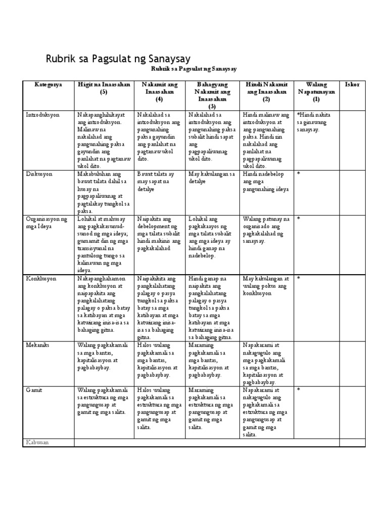 Rubrik Sa Pagsulat Ng Sanaysay Pdf